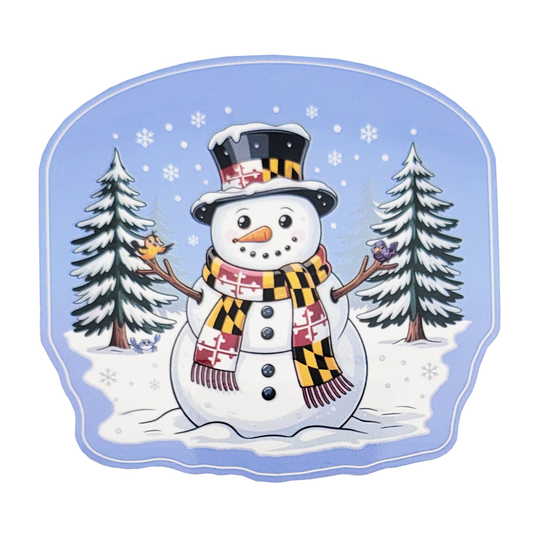 Say hello to our Maryland Snowman Winter Wonderland die cut sticker! Featuring our exclusive design of an adorable snowman with his Maryland Flag themed scarf and hat. Joining him in the snowy scene are a few small friends - an Oriole, a Raven and a crab (hiding).