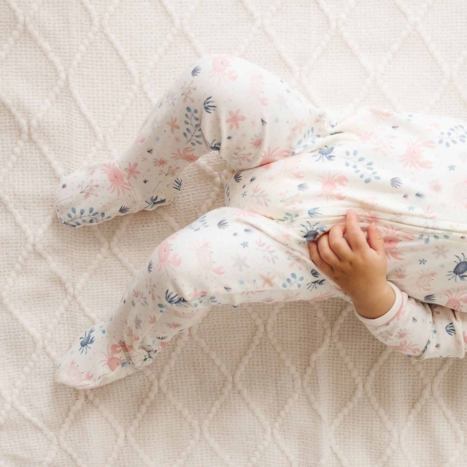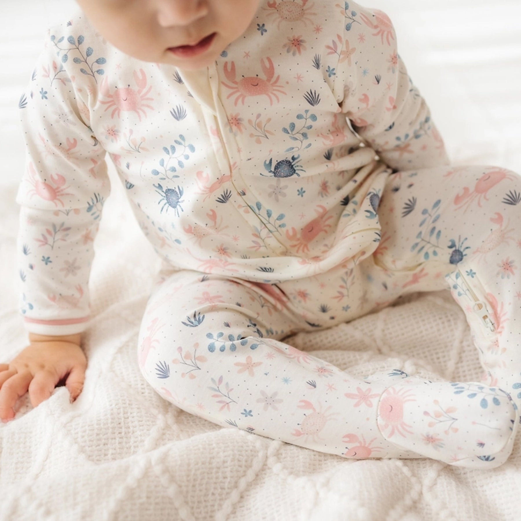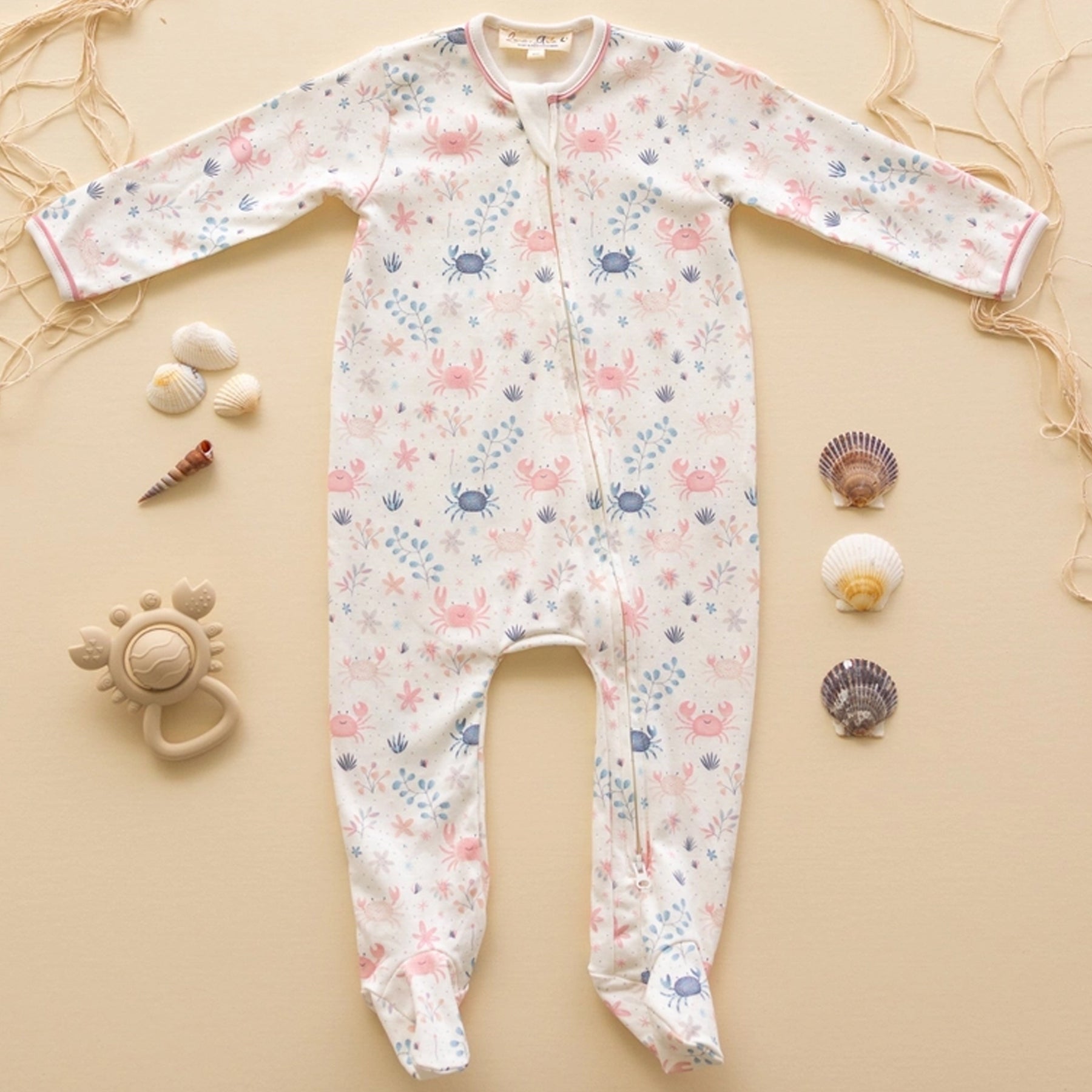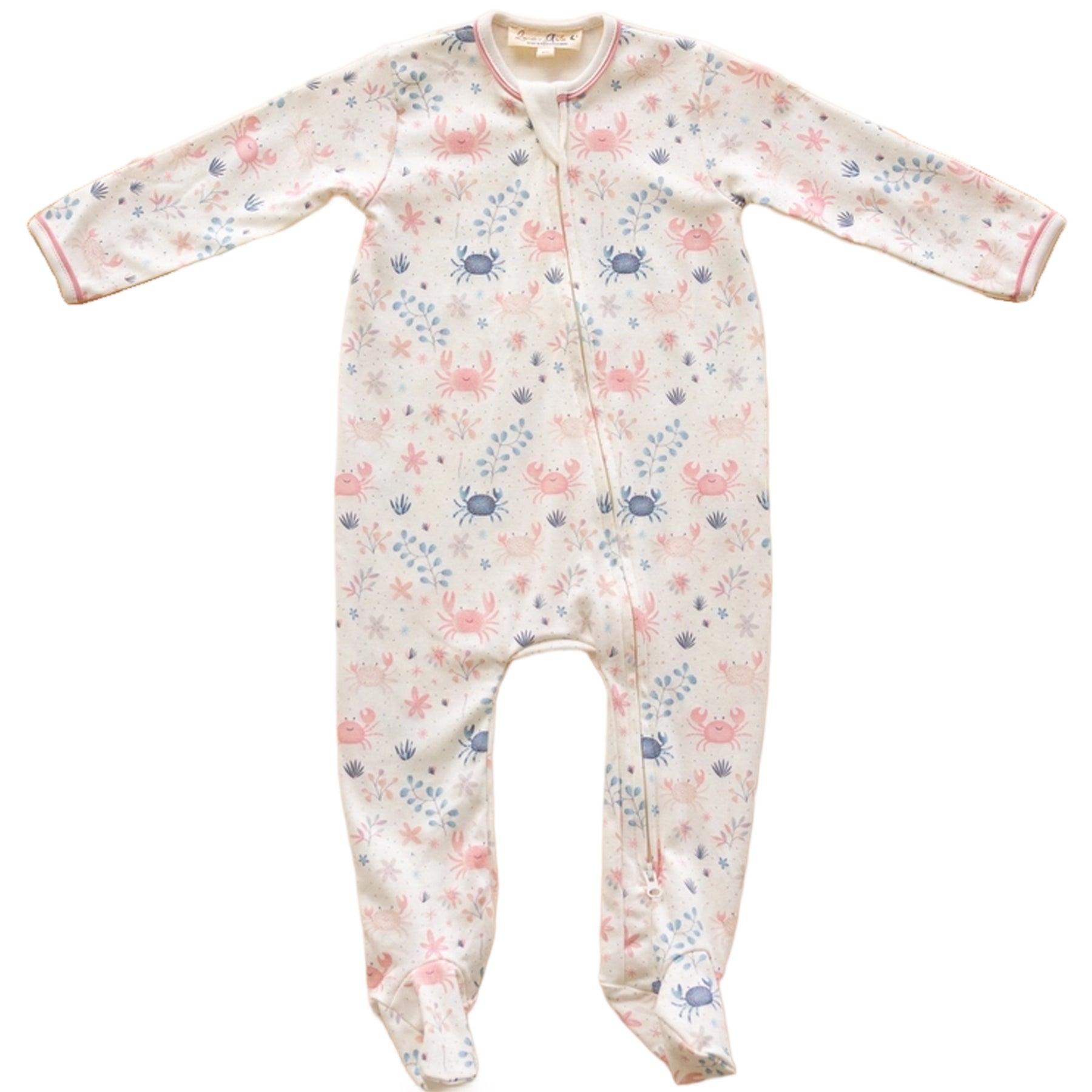 Features: 100% premium Pima cotton for exceptional softness; Playful Crabby Cove print in soft colors of dusty rose and blue; Footed onesie design to keep baby warm and cozy; Front zipper closure for easy dressing and diaper changes; Soft, breathable fabric gentle on baby’s skin; Perfect for sleep, play, and everyday comfort.