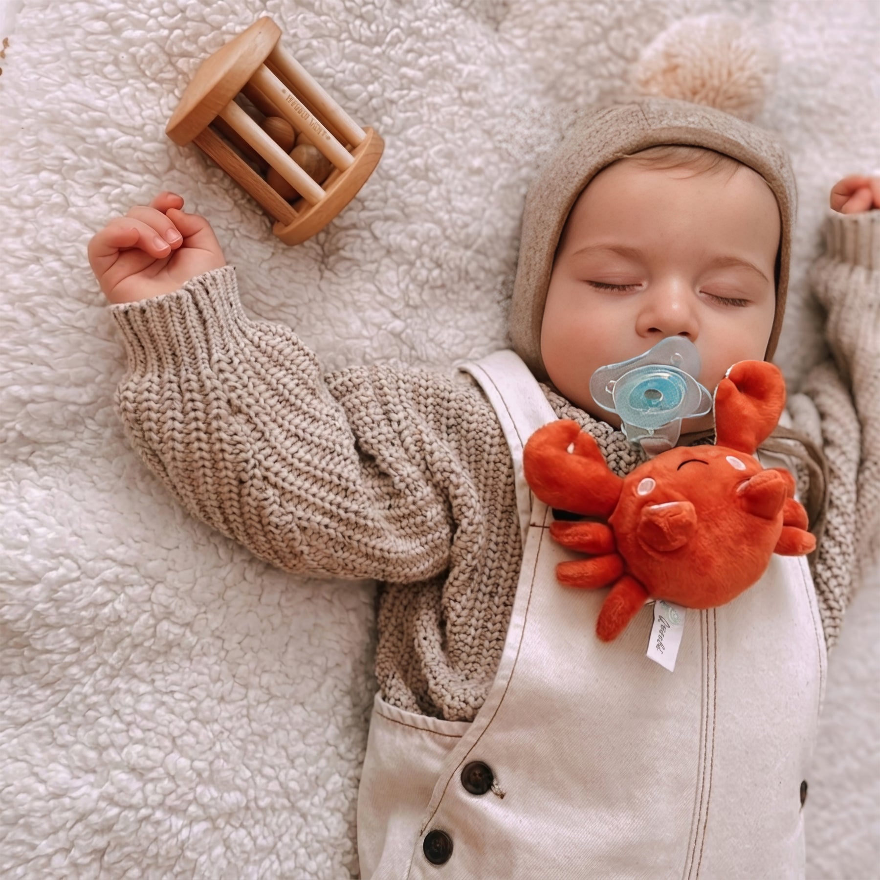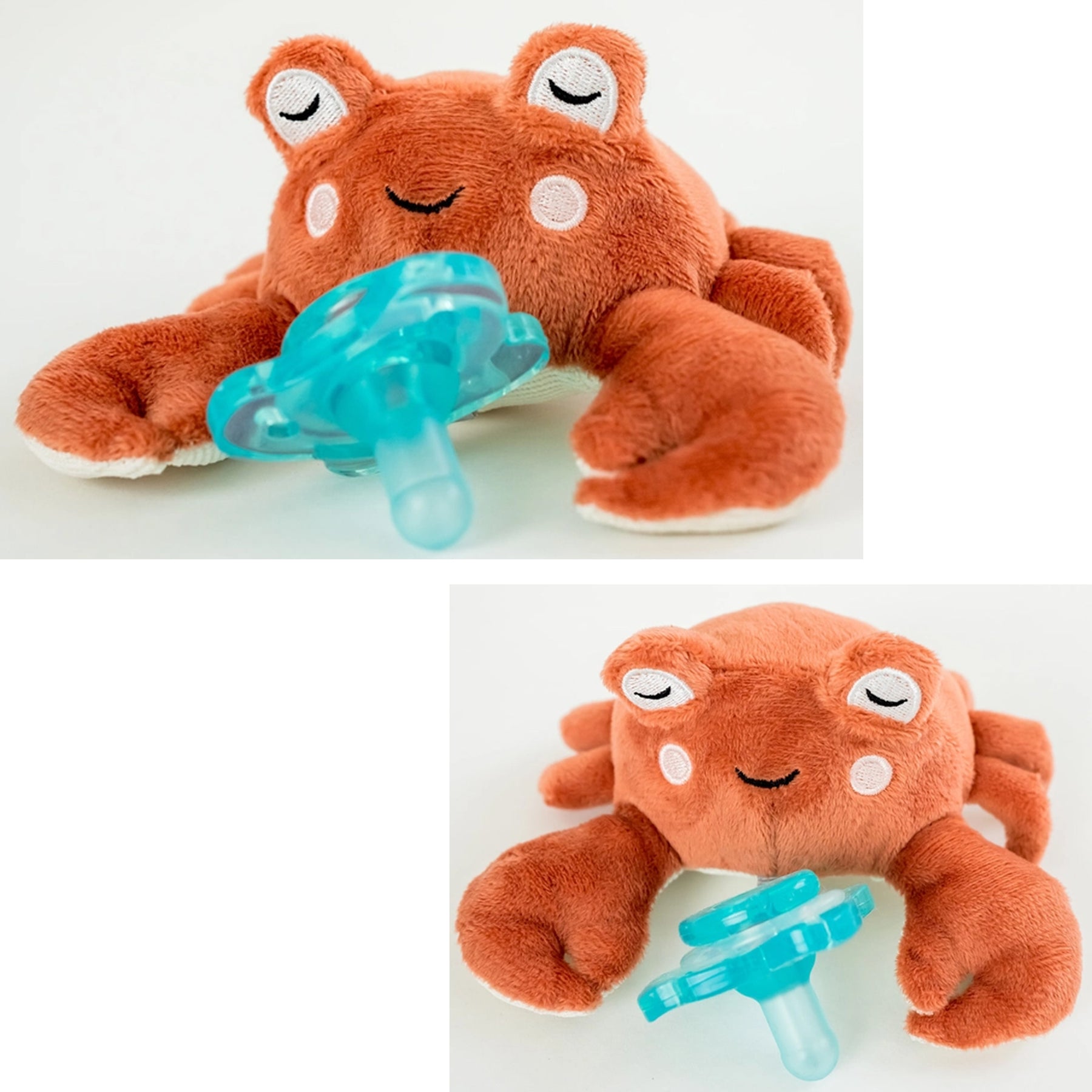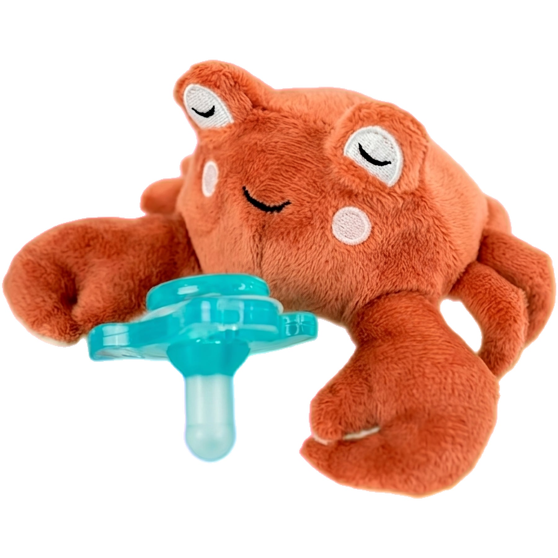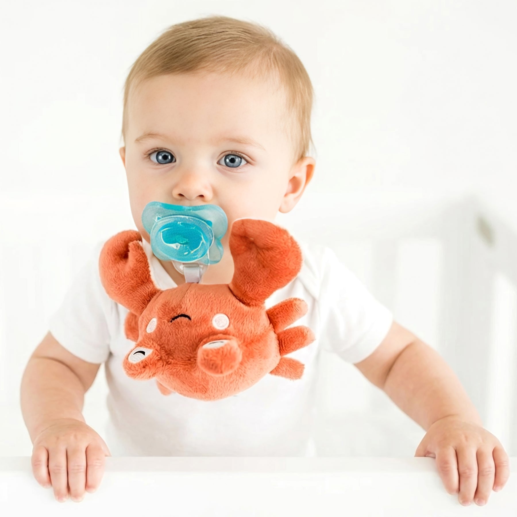 Our Plush Crab Toy Baby Pacifier is soft and lightly weighted. Perfectly sized for little hands. The contoured pacifier comfortably fits baby's face and the crab is easy to find and hold. Makes a great baby shower gift!