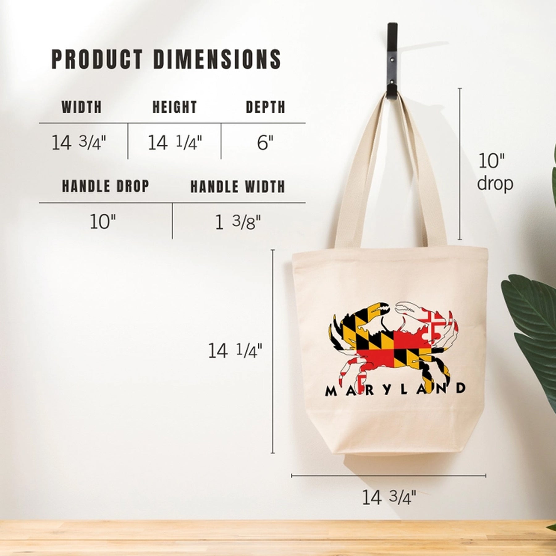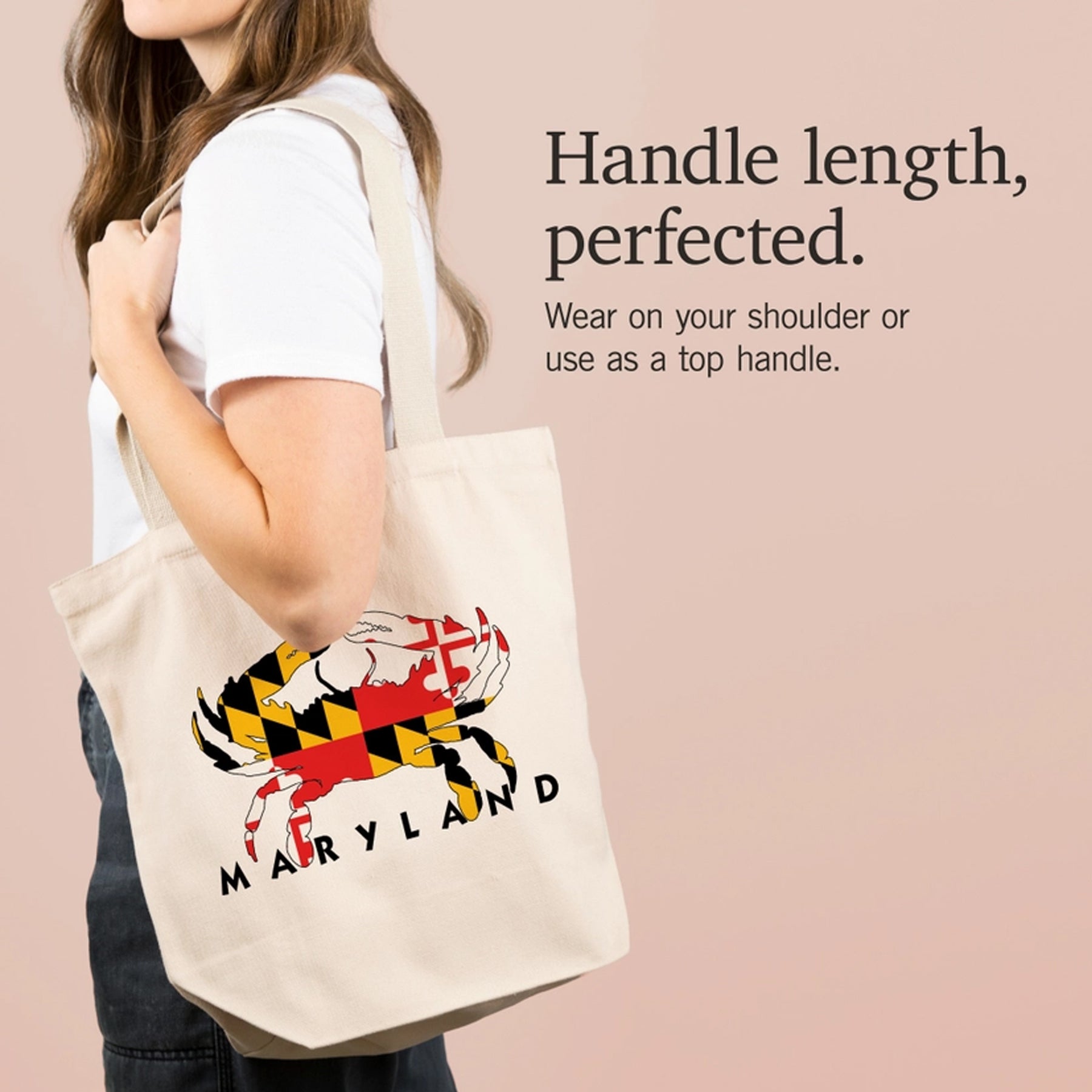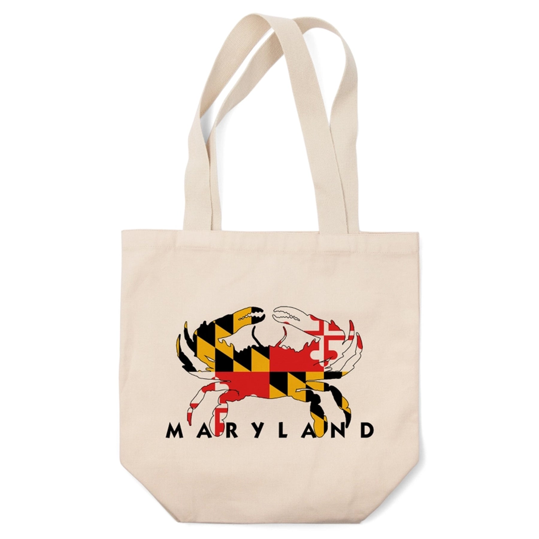 This cotton totebag features a Crab shape filled with our Maryland state flag and it says "Maryland" at the bottom, all on a natural cream background. 100% cotton.