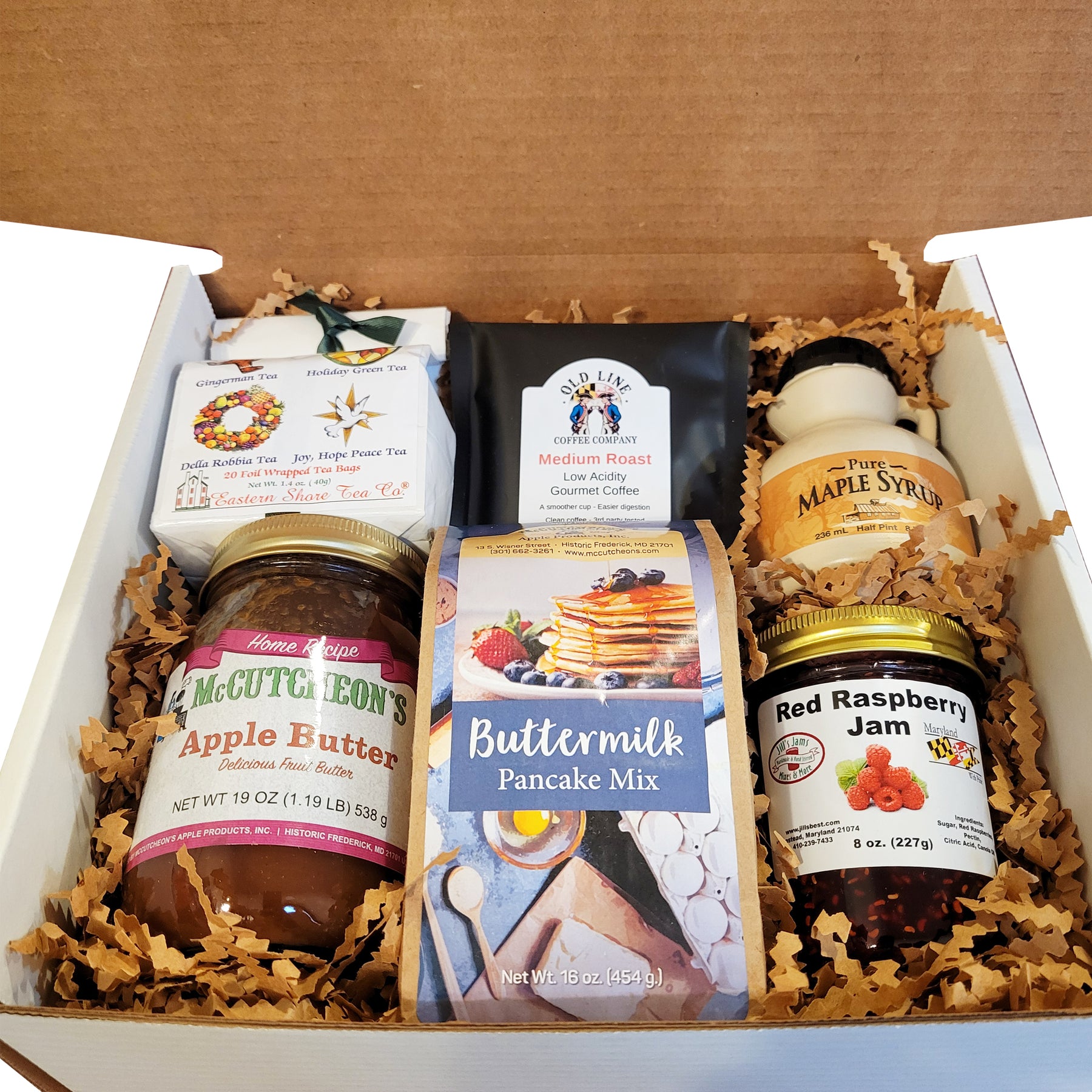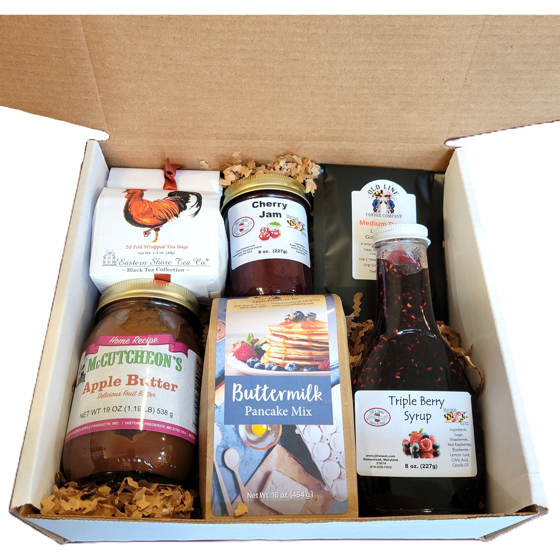 Enjoy a delicious breakfast Maryland style! You'll get Buttermilk Pancake Mix, Eastern Shore Tea bags, Coffee, Grade A Maryland Made Maple Syrup, a jar of delicious small batch jam or jelly, and a jar of Old Fashioned Apple Butter.