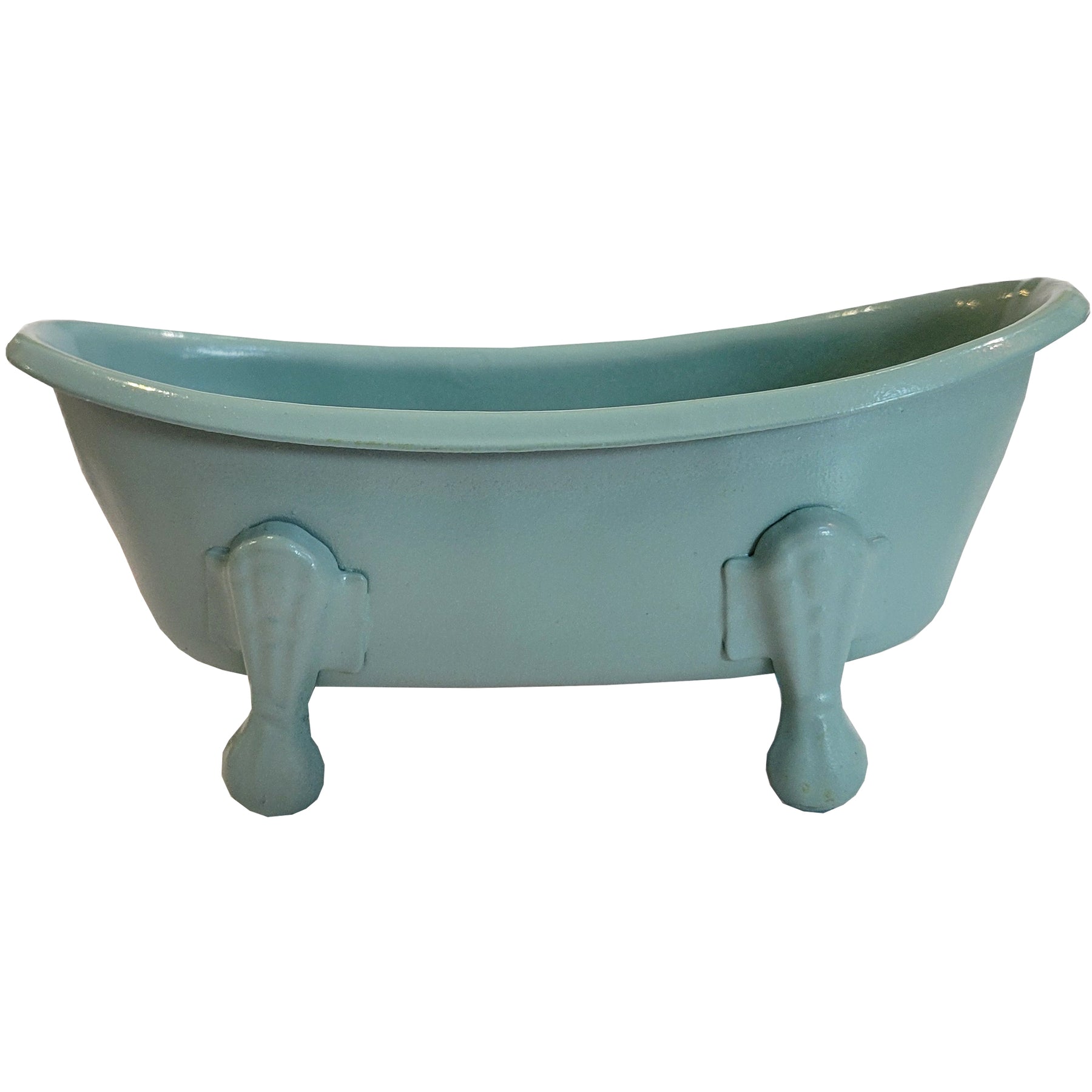This distressed claw foot style bathtub soap dish is adorable! Rustic enameled metal. Choose from: white with a black rim, solid white, blue or solid black. Pick up one today along with a bar of our wonderful natural soaps! Approx. 5 1/2" long x 2 1/2" wide.
