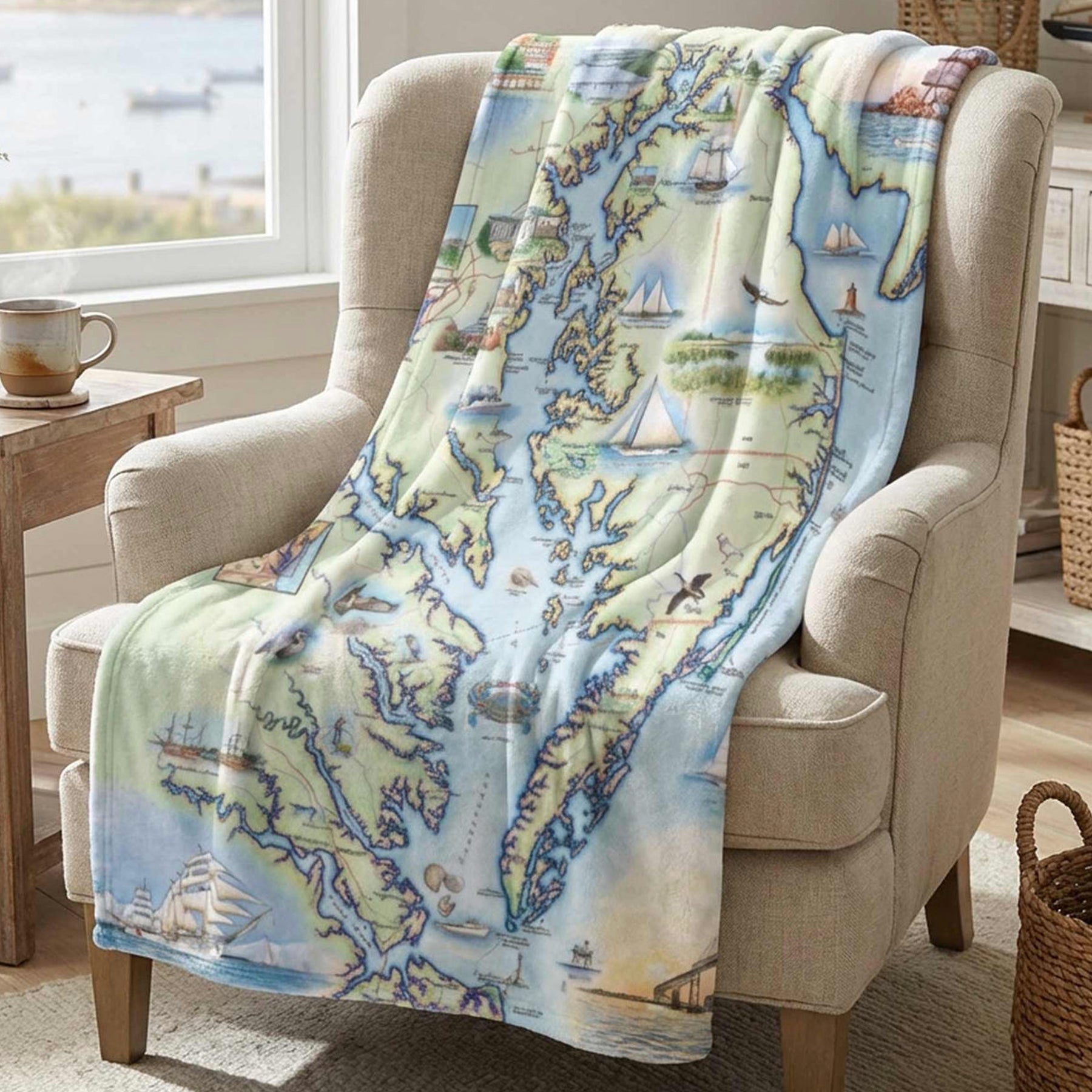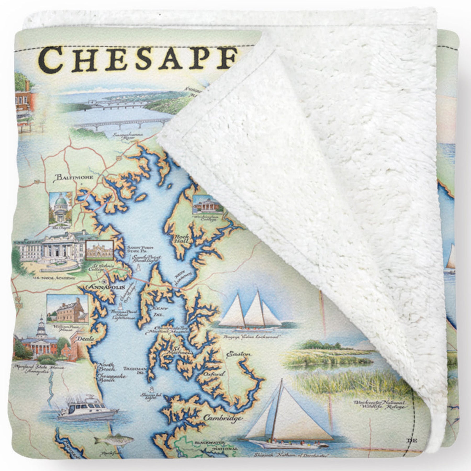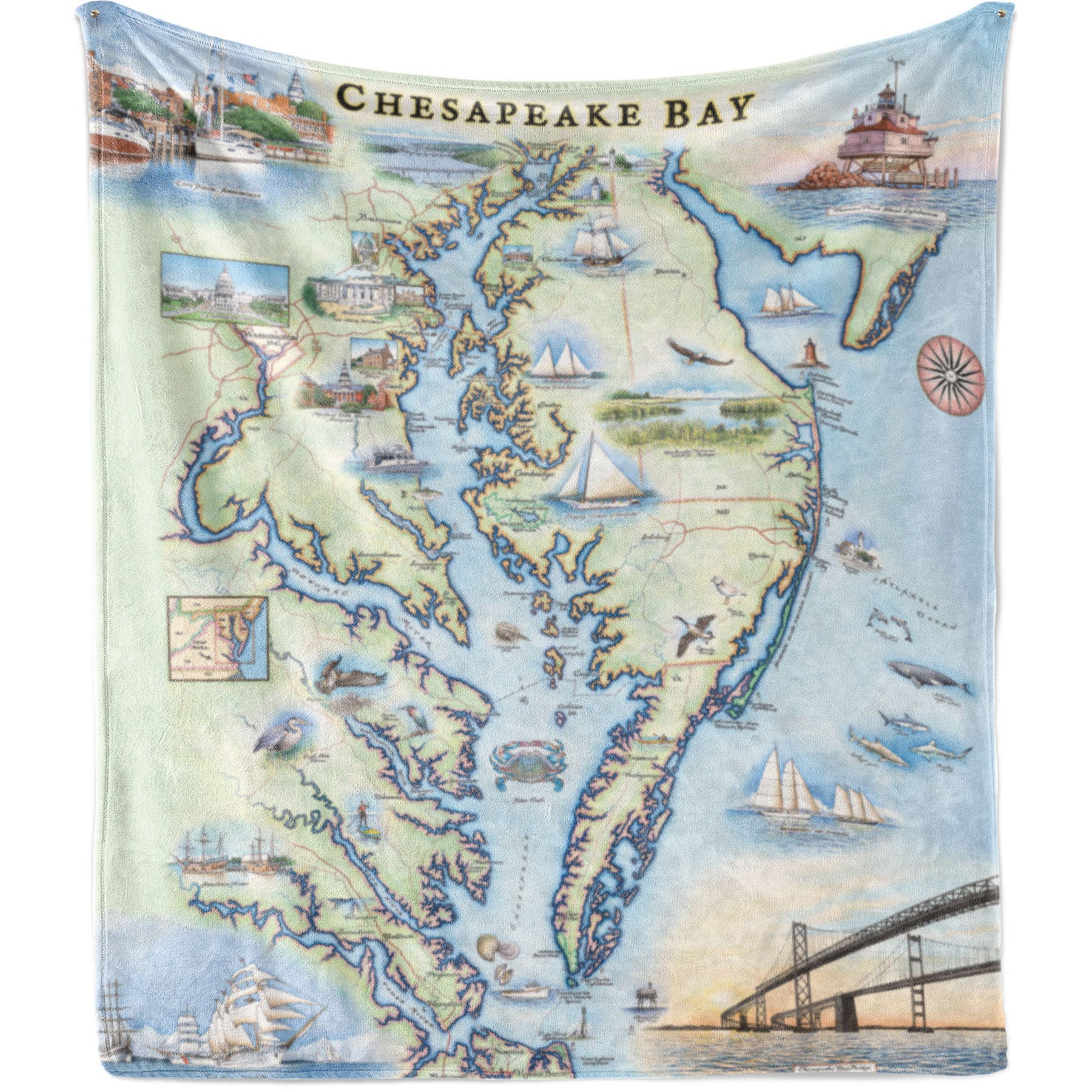 This Chesapeake Bay Map Fleece Blanket is beautiful and soft! Perfect for snuggling on the couch on a winter day! Toss on the floor for a soft spot for your toddler to play or nap. Made of a cloud-like fleece blend for softness, warmth and a lightly weighted feel. Created from an original hand-drawn illustration that includes the Bay, sailboats, skipjacks, Thomas Point Shoal Lighthouse, Blue Crabs, Ospreys, and Atlantic Bottlenose Dolphins across the map. Regional highlights include Annapolis, Baltimore, Washington D.C., St. Michaels, and much more.