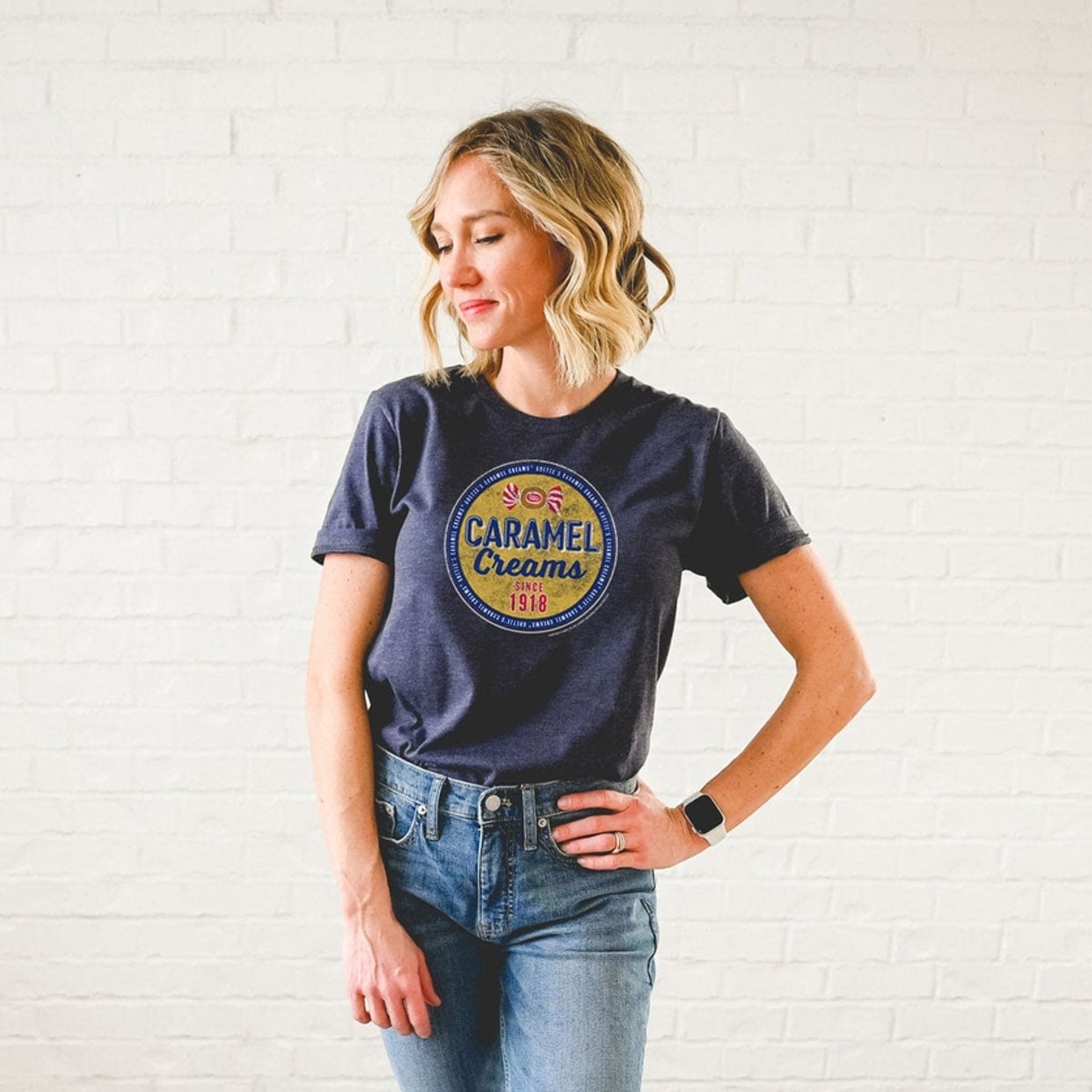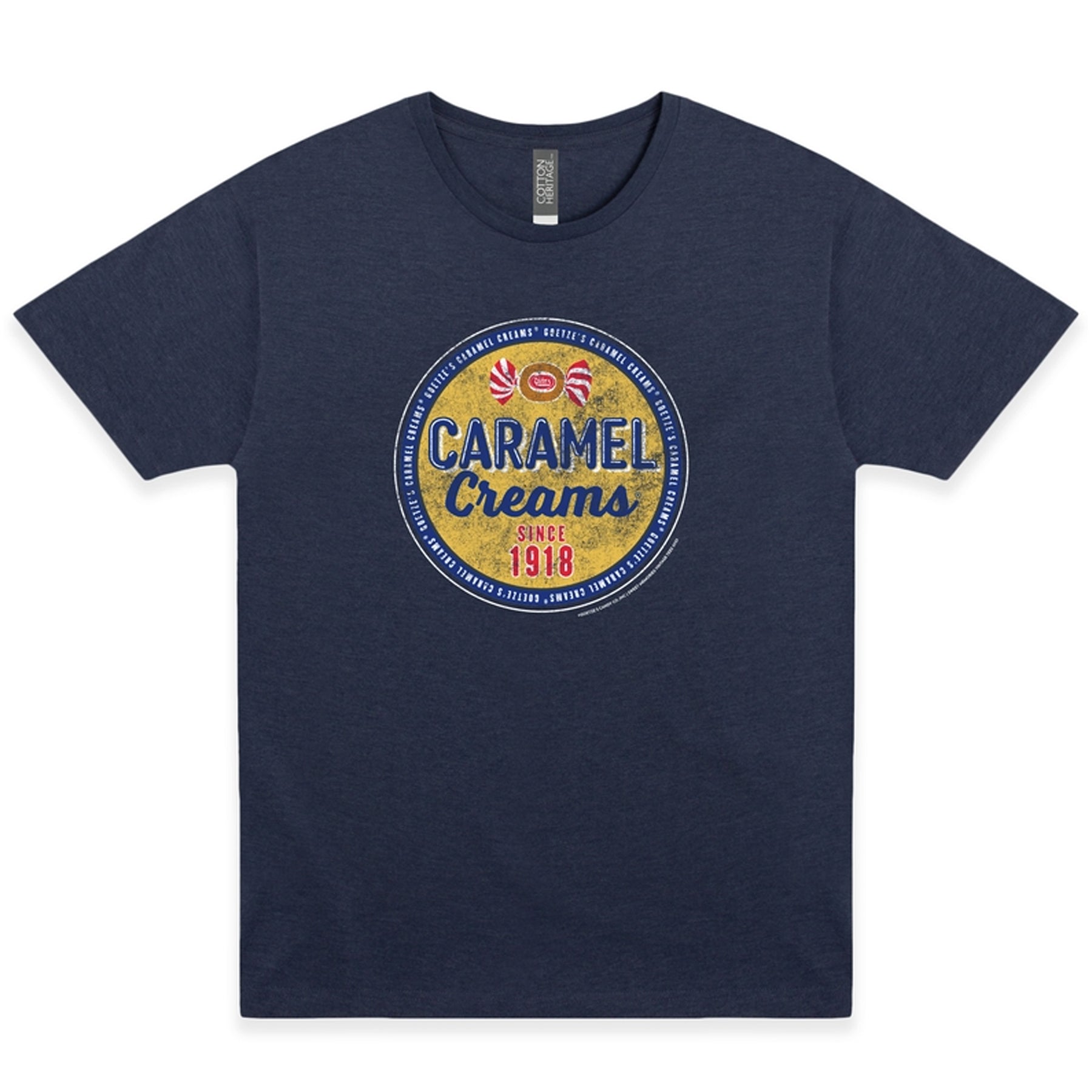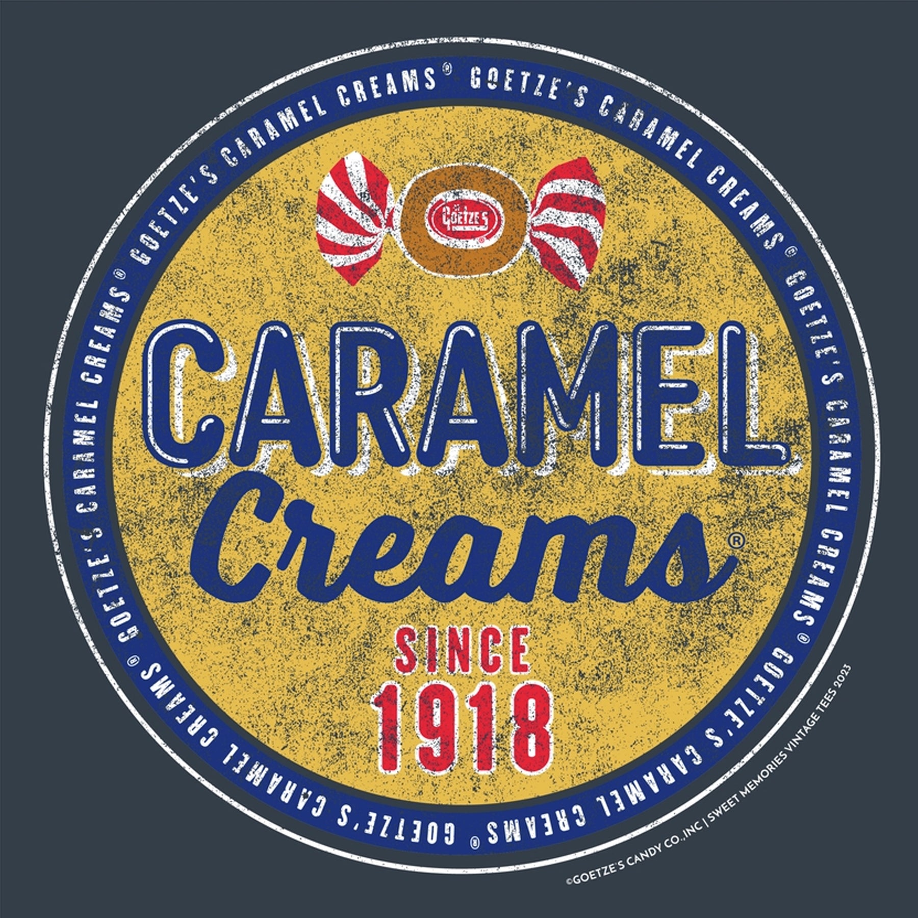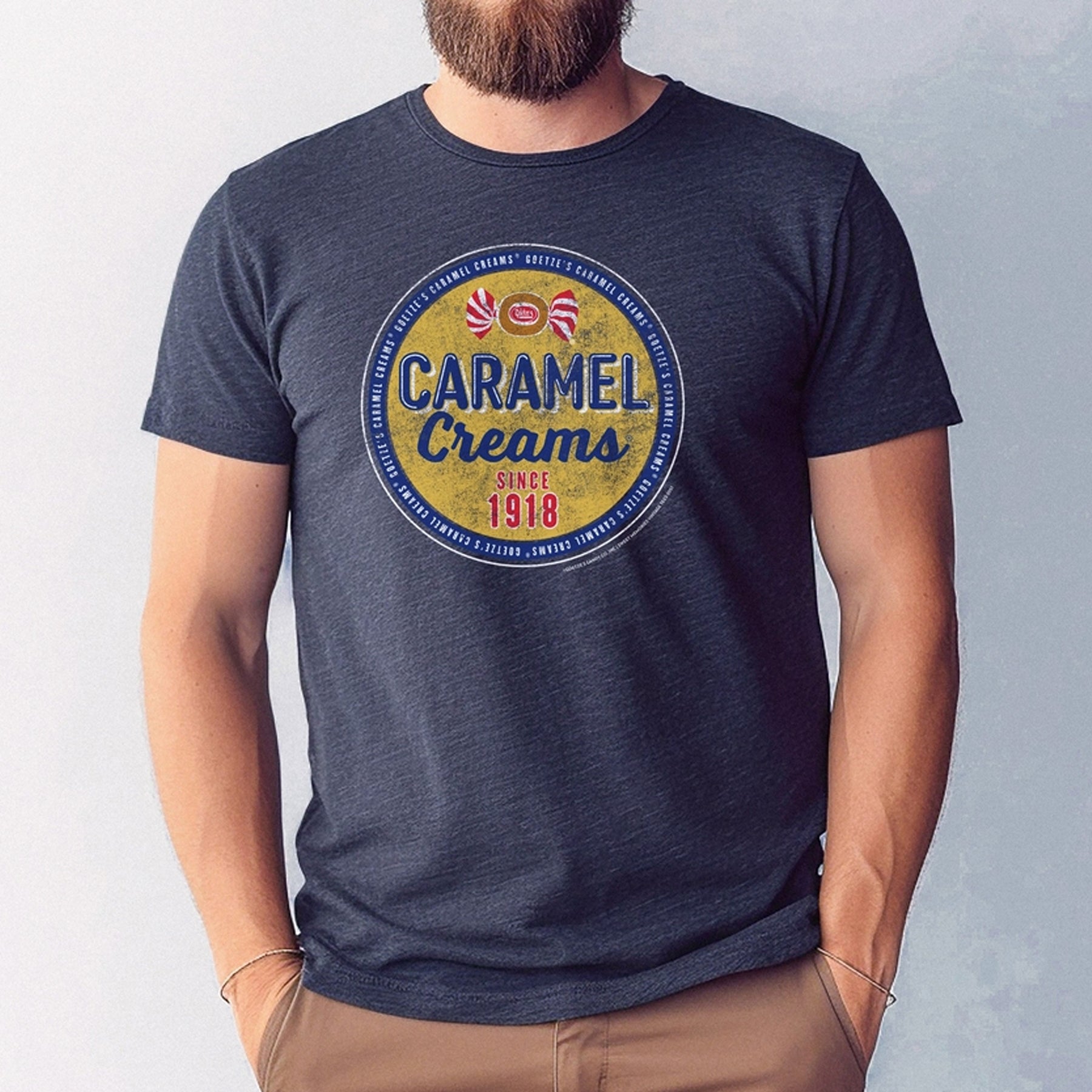 Indulge your sweet tooth with this nostalgic Goetze's® Caramel Creams - A Classic Since 1918 T-Shirt featuring the iconic Goetze's round logo! Since 1918, these chewy candies with a soft caramel center have been a beloved treat, satisfying sweet tooth's for generations. This vintage-inspired tee features a slightly distressed graphic, a tribute to a candy legend Perfect for candy lovers and retro style enthusiasts alike.