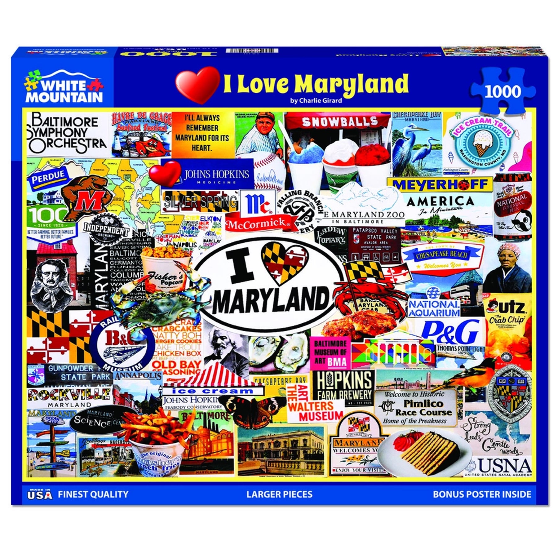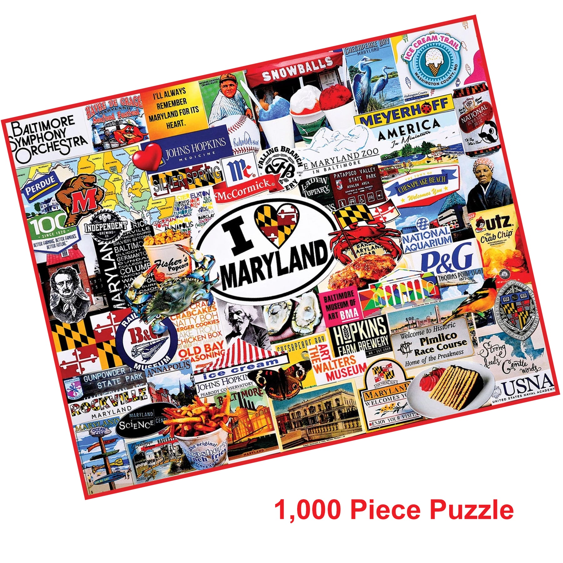 This I Love Maryland Puzzle features 1,000 pieces and a design of many iconic Maryland attractions, scenes, foods, locations, buildings and much more! One of the largest puzzles we sell at a finished size of 30" x 24".