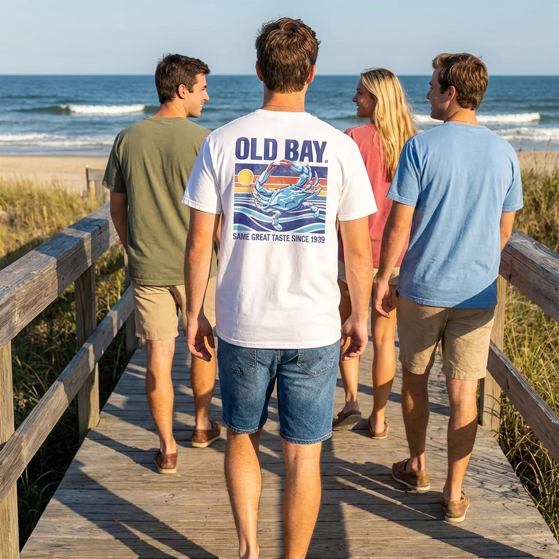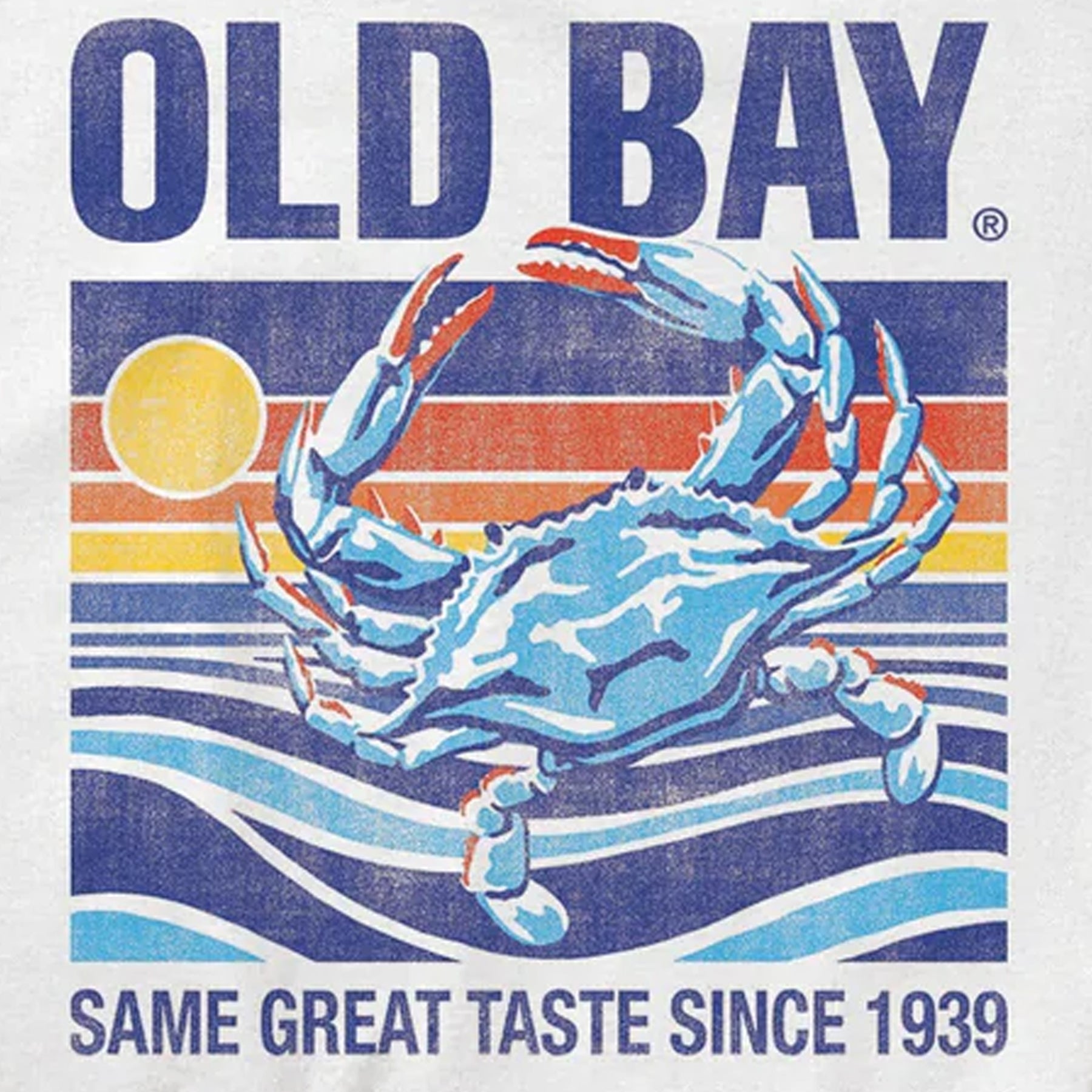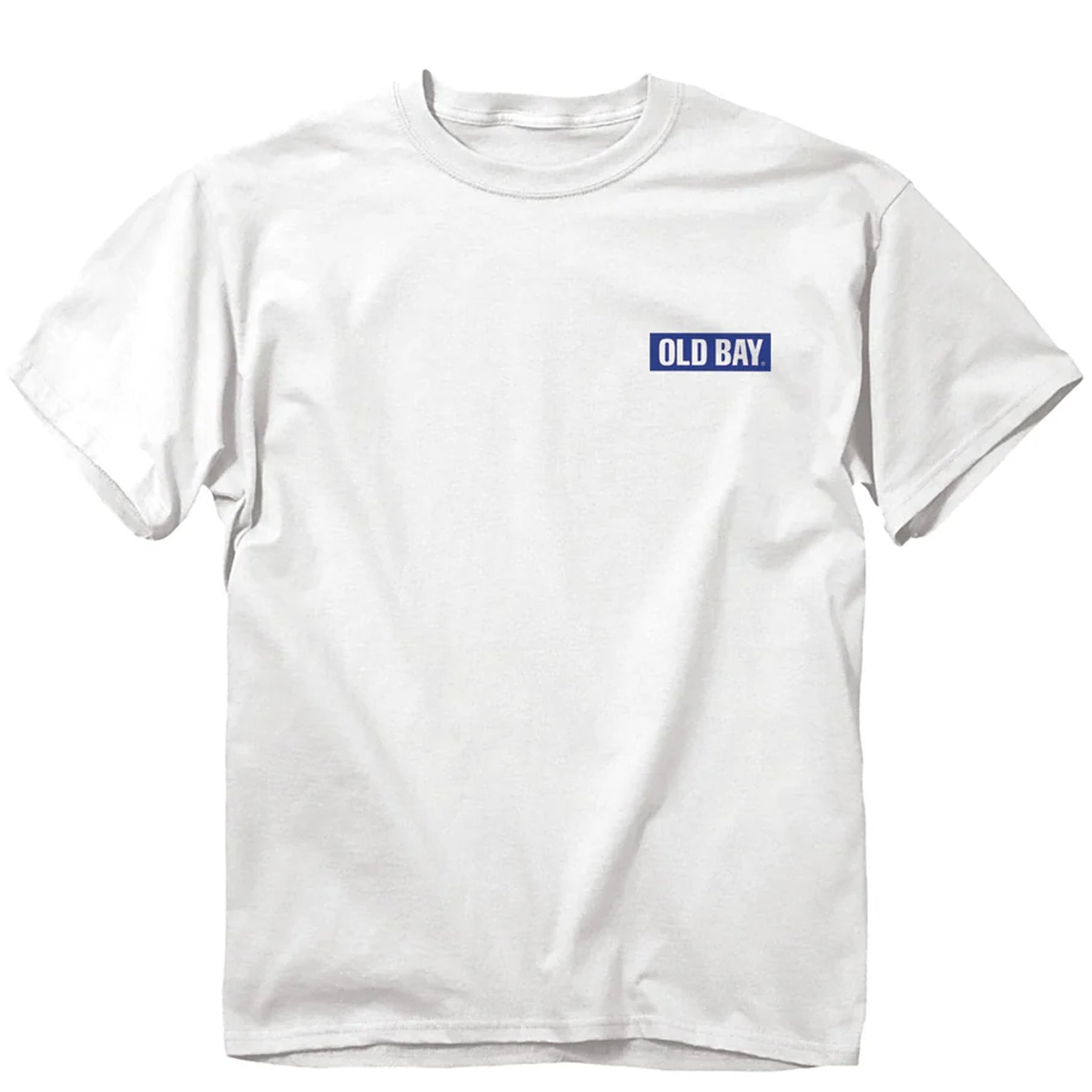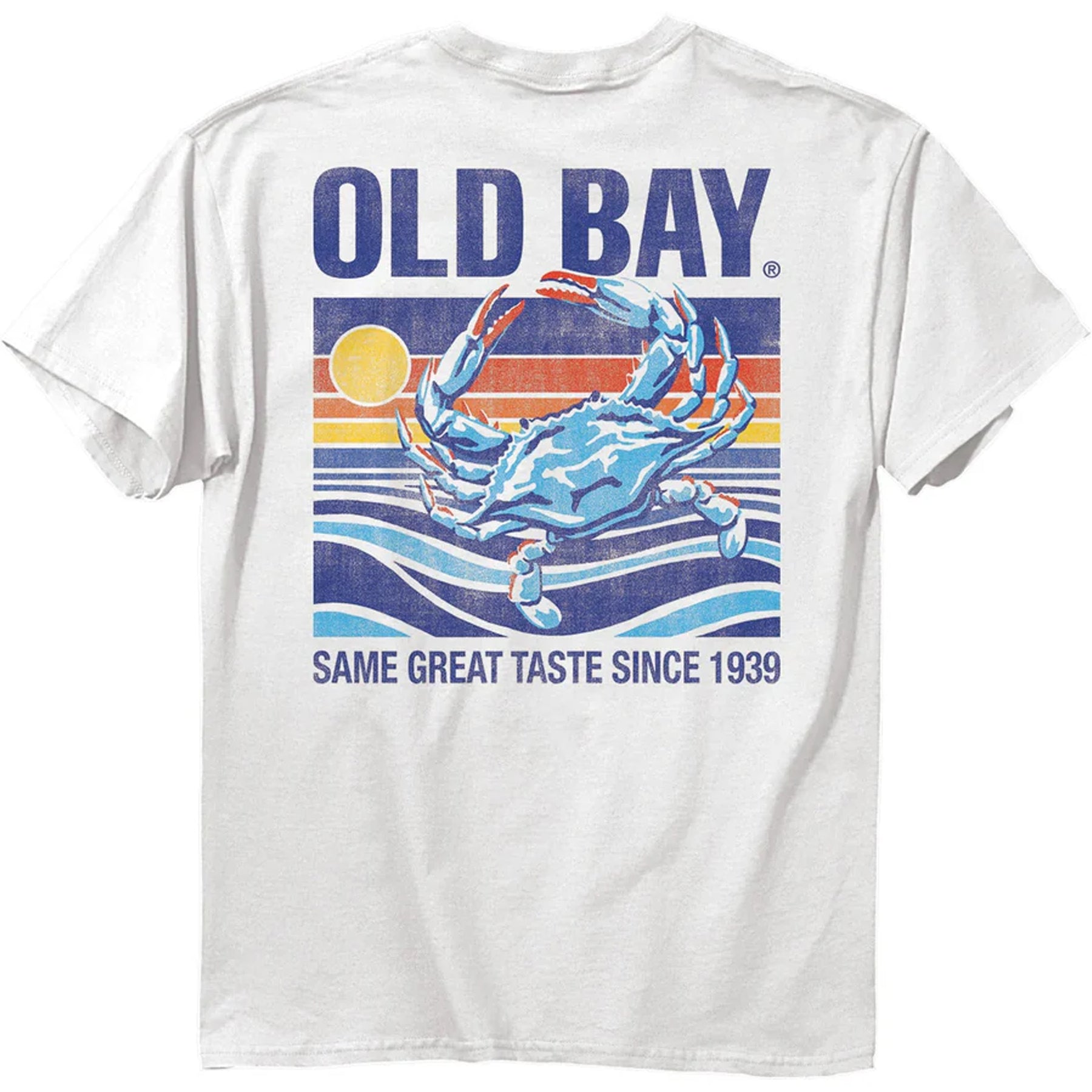 Officially licensed Old Bay T-Shirt. This t-shirt features a retro crab water scene that says "Old Bay" at the top and "Same Great Taste Since 1939" at the bottom of the weathered design that is screen printed on a white t-shirt. The front left chest says "Old Bay".
