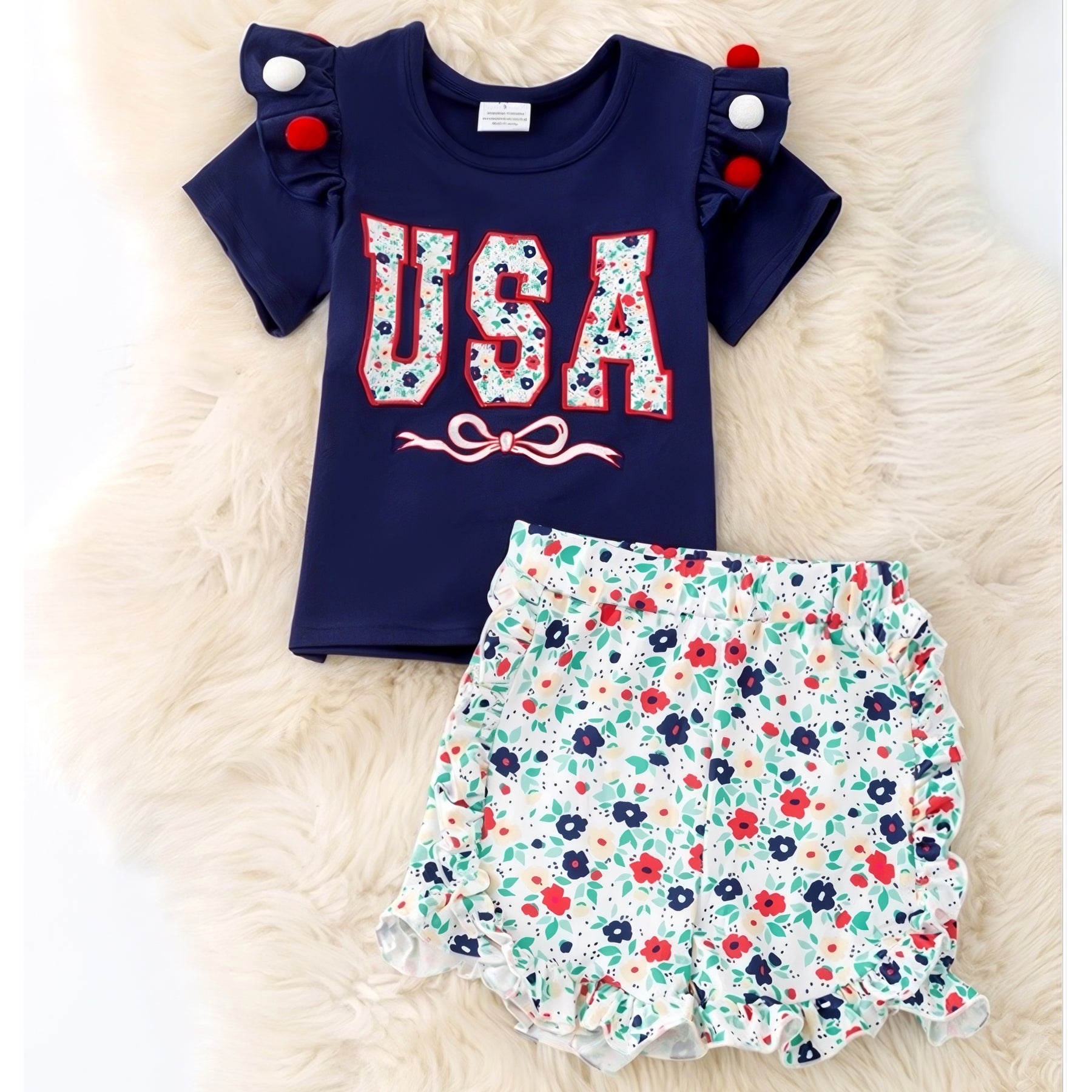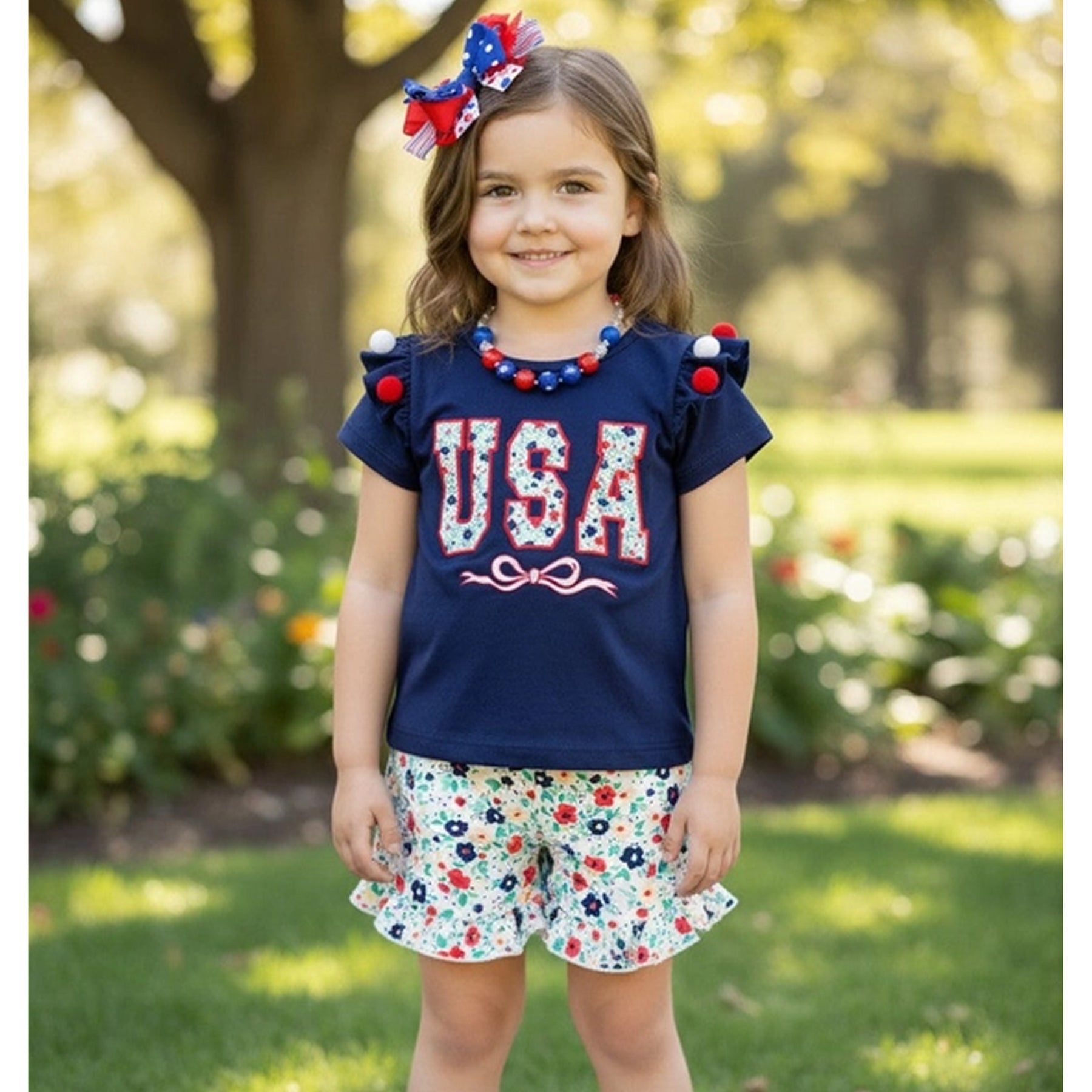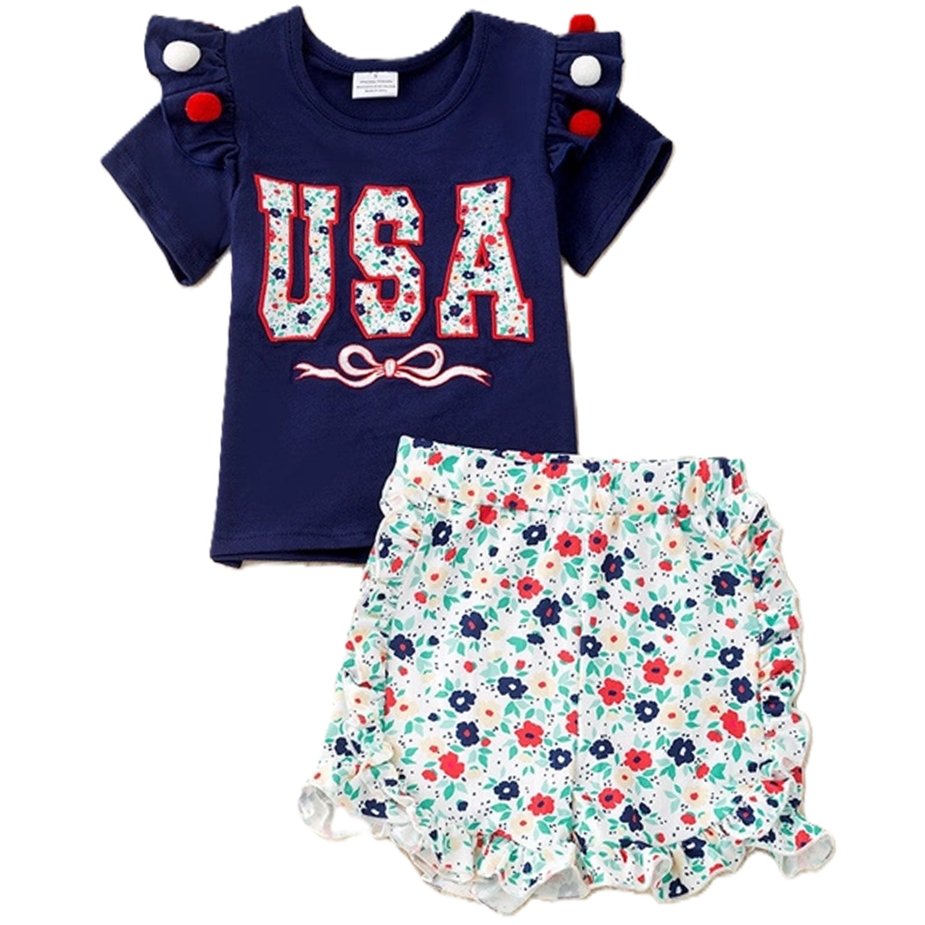Step out in style with our USA Floral Applique Ruffle Top & Floral Shorts Set! Featuring a beautiful navy blue top paired with floral shorts, this outfit is perfect for any summer occasion. Add a touch of patriotic flair to your little girls wardrobe!