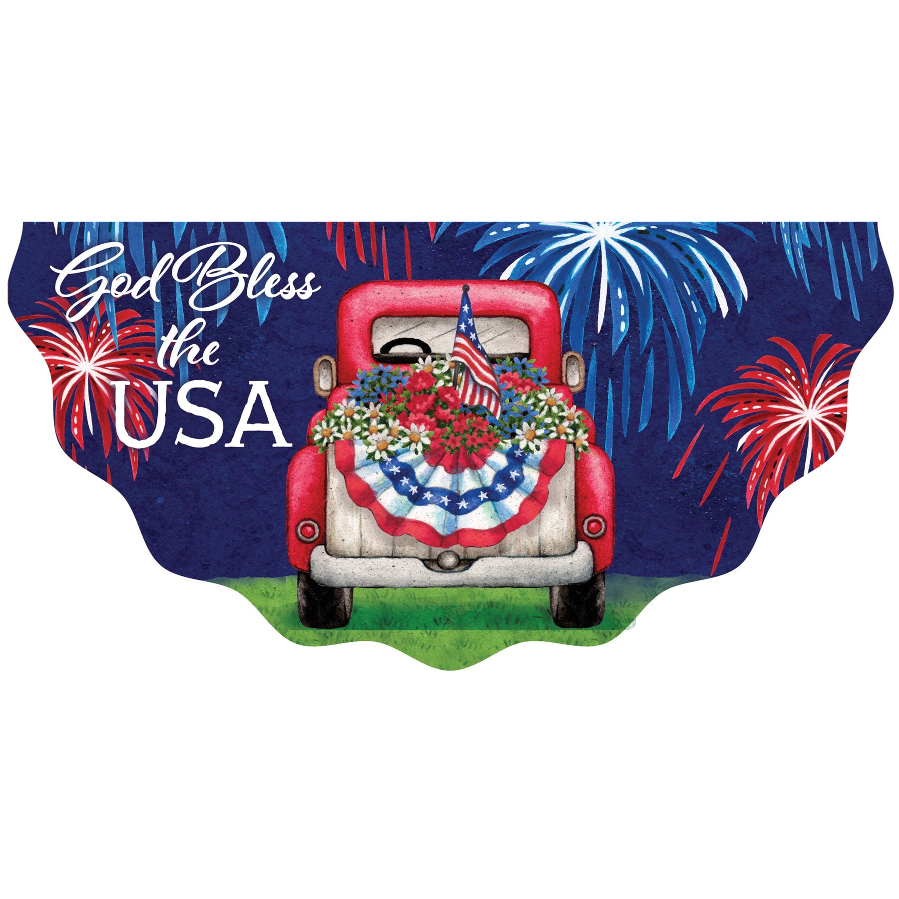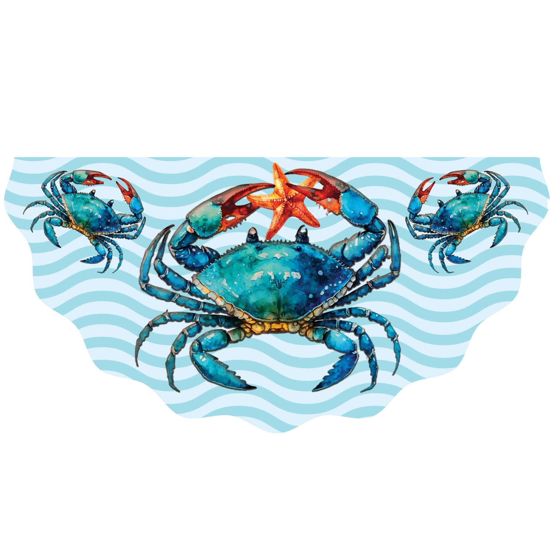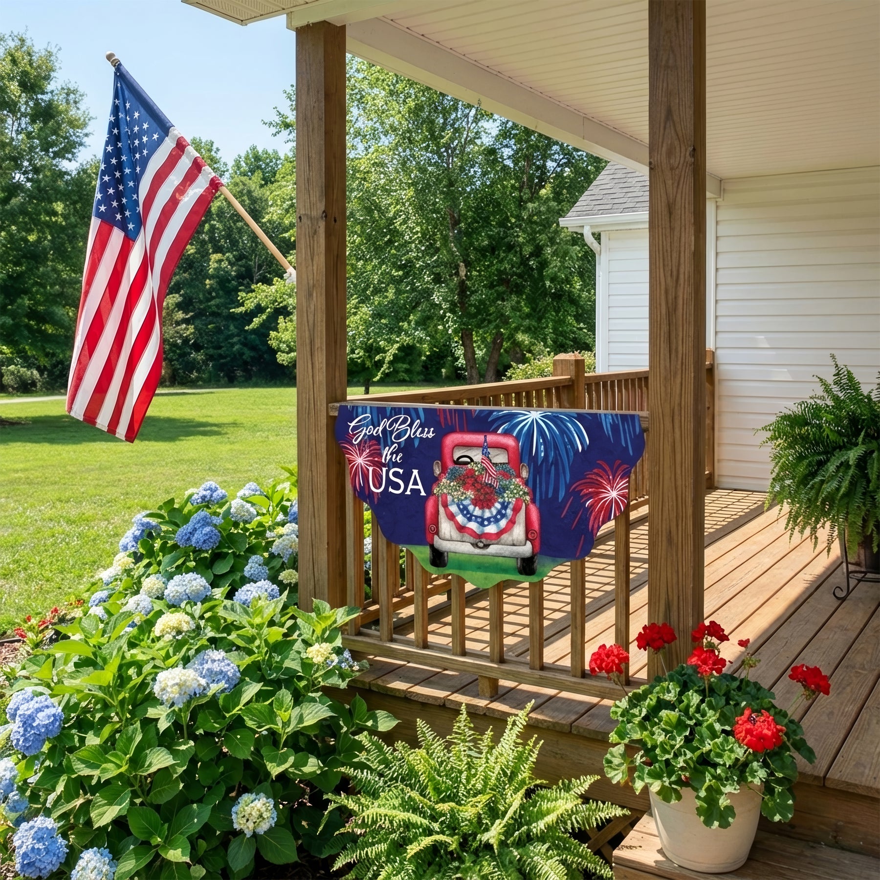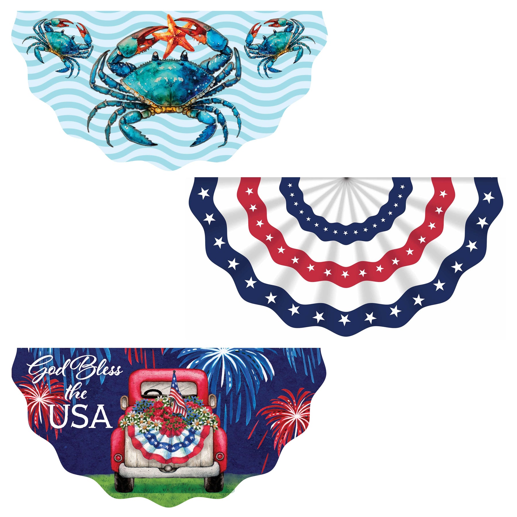 This collection of vinyl bunting feature assorted designs including patriotic American flag styles and a Blue Crab too! A colorful, welcoming addition to your home! The design is printed on one side of the scallop edged vinyl. Hang from your deck or front porch railing with the included grommets.
