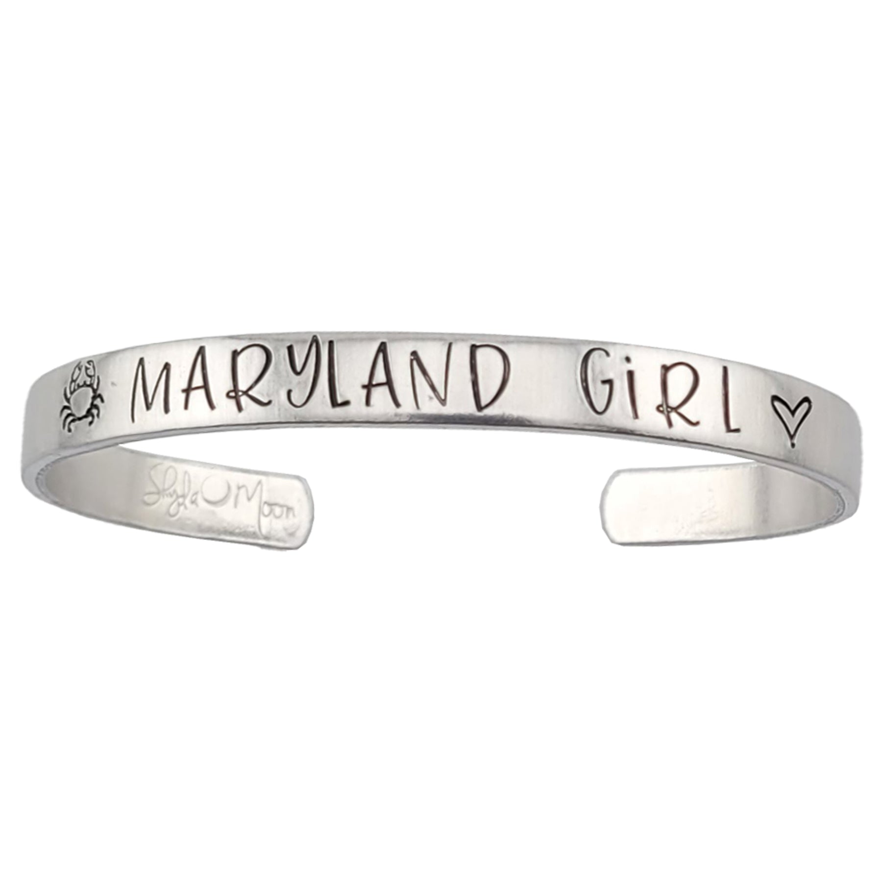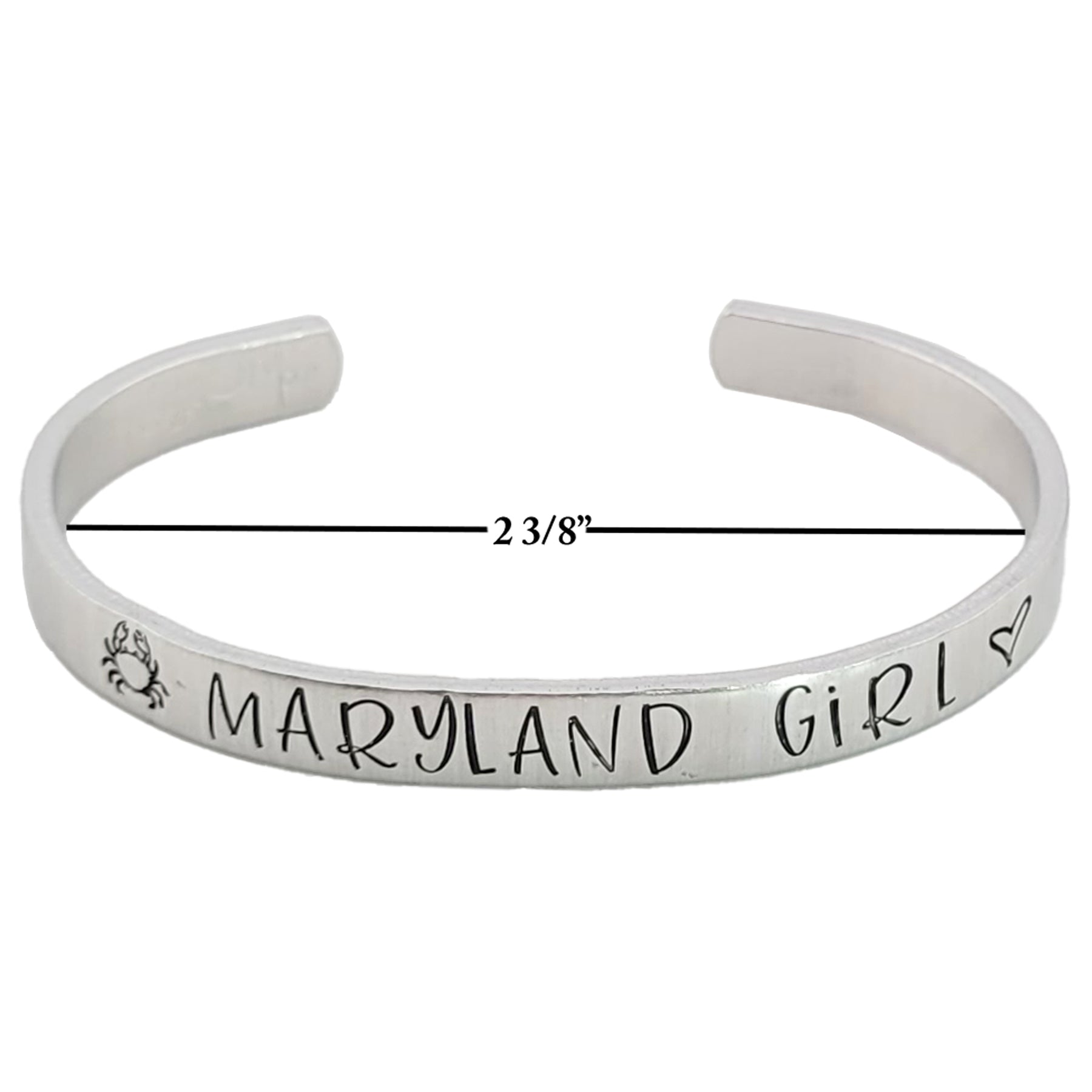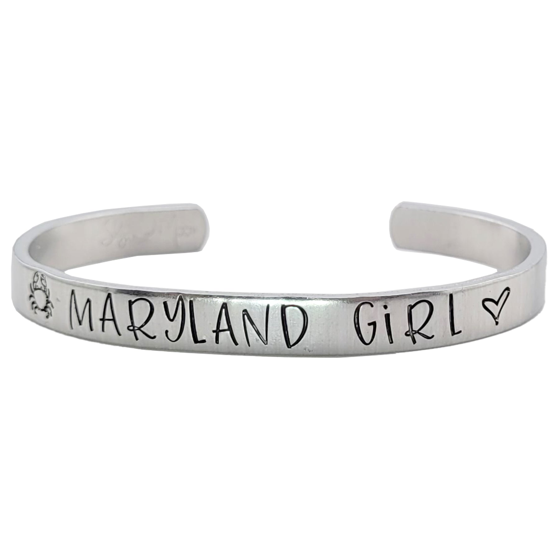 Our hand stamped Maryland Girl aluminum cuff bracelets are made by a small business just for us, and you! There is a tiny crab before the "M" and a small heart after the "L".