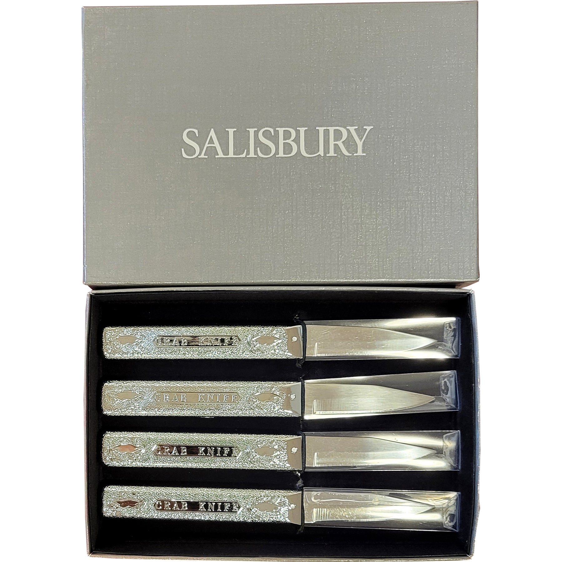 This style of crab knife is famous with crab pickers throughout Maryland. Once made by the Carvel Hall Company in Crisfield (they are no longer in business) these crab knives are made from the original Carvel Hall molds and have a rivet through the blade and tang (handle). Each knife carries the Carvel Hall name on one side of the handle and "Crab Knife" on the other side and is weighted to give the user a balanced feel. Also useful as a paring knife! Chrome Plated Weighted Handle. Stainless Steel 2 1/2" Sharp Blade. 6 1/8" overall length. Set of 4 in a gray gift box.